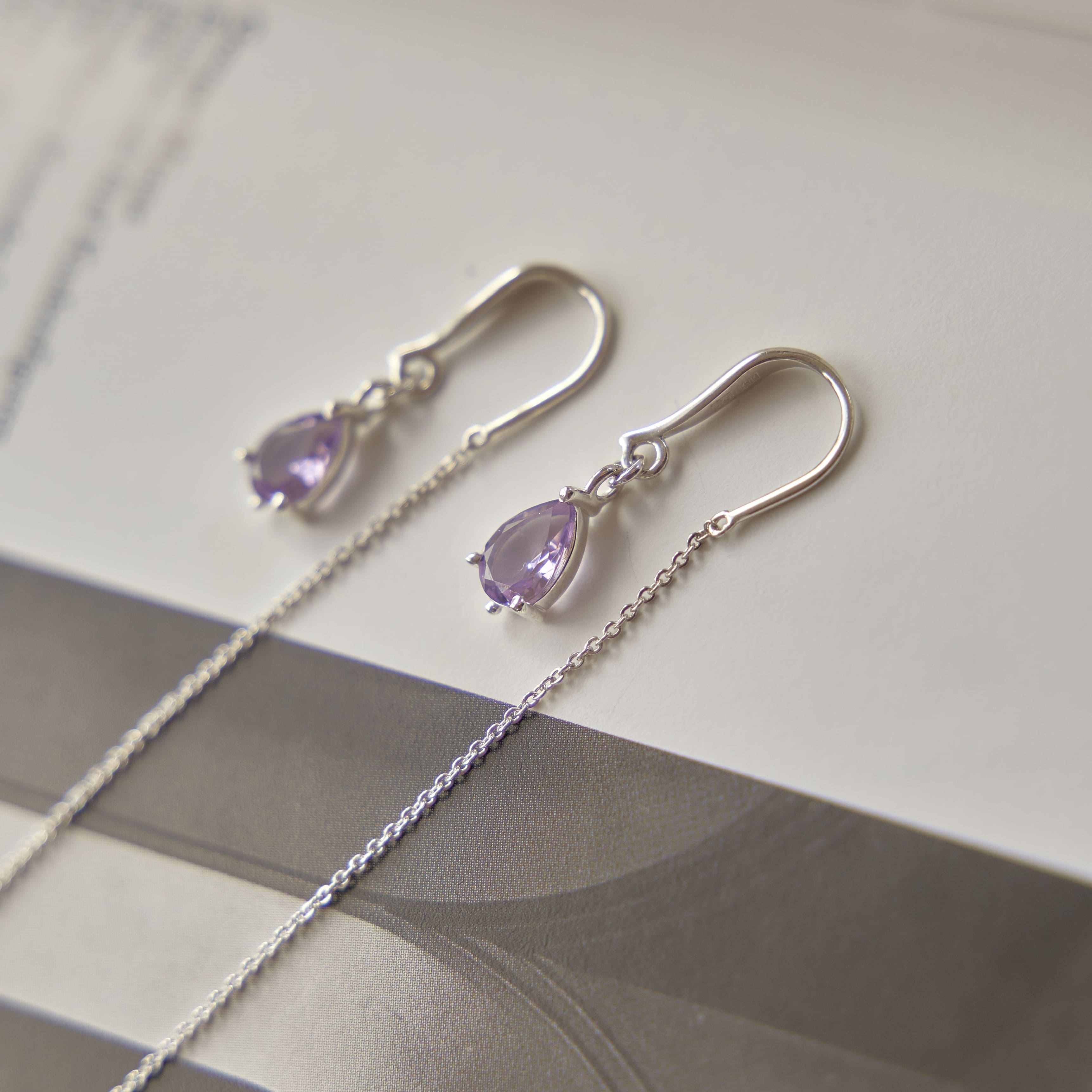 Эти нарядные протяжки имеют удобную форму штырька и надежно держатся в проколе. Маленькая подвеска с аметистом в огранке «Груша» красиво ловит свет и искрится, а благодаря продуманным деталям, декоративный элемент обращен в нужную сторону.