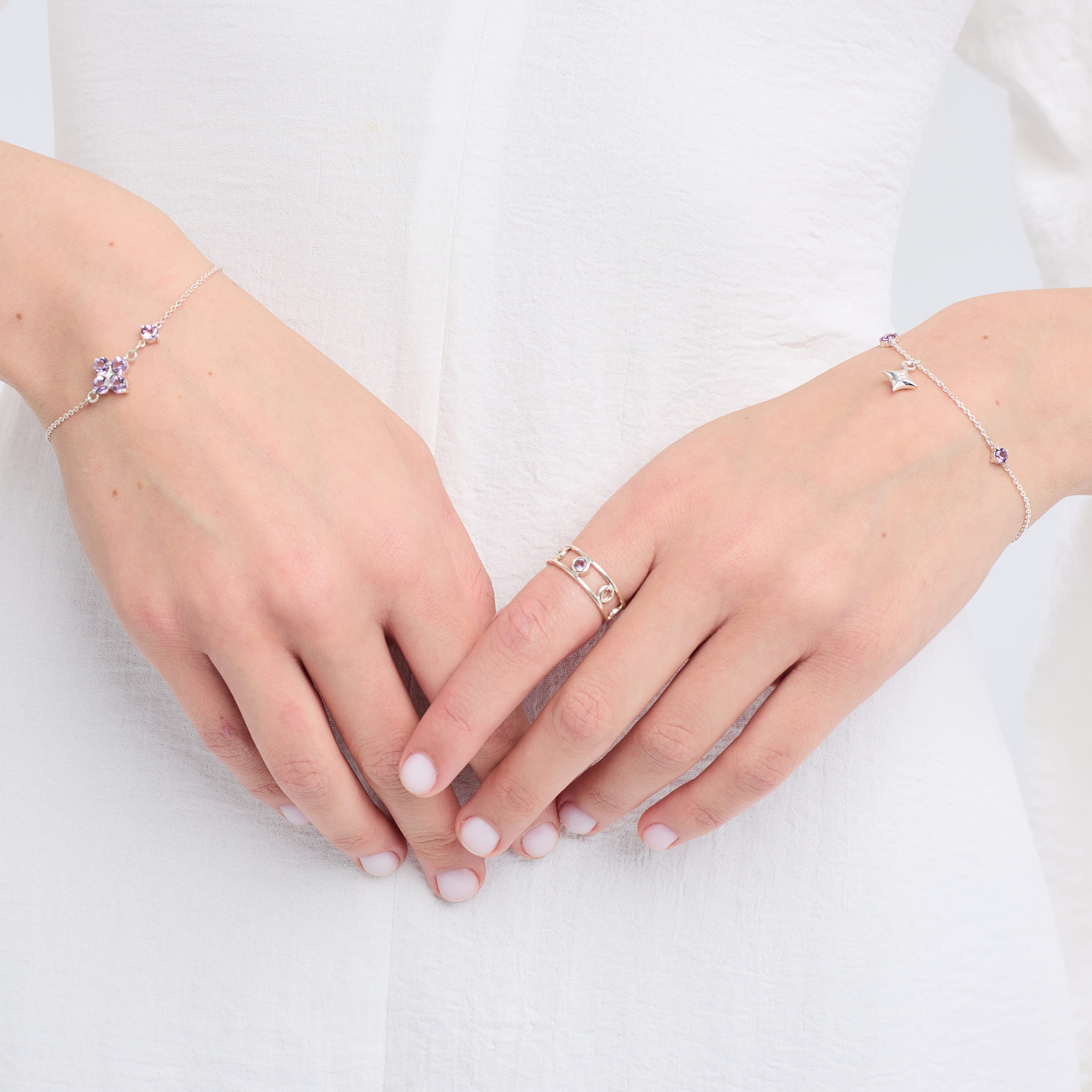Эффектное кольцо с кругом, составленным из четырех аметистов в огранке Маркиз.