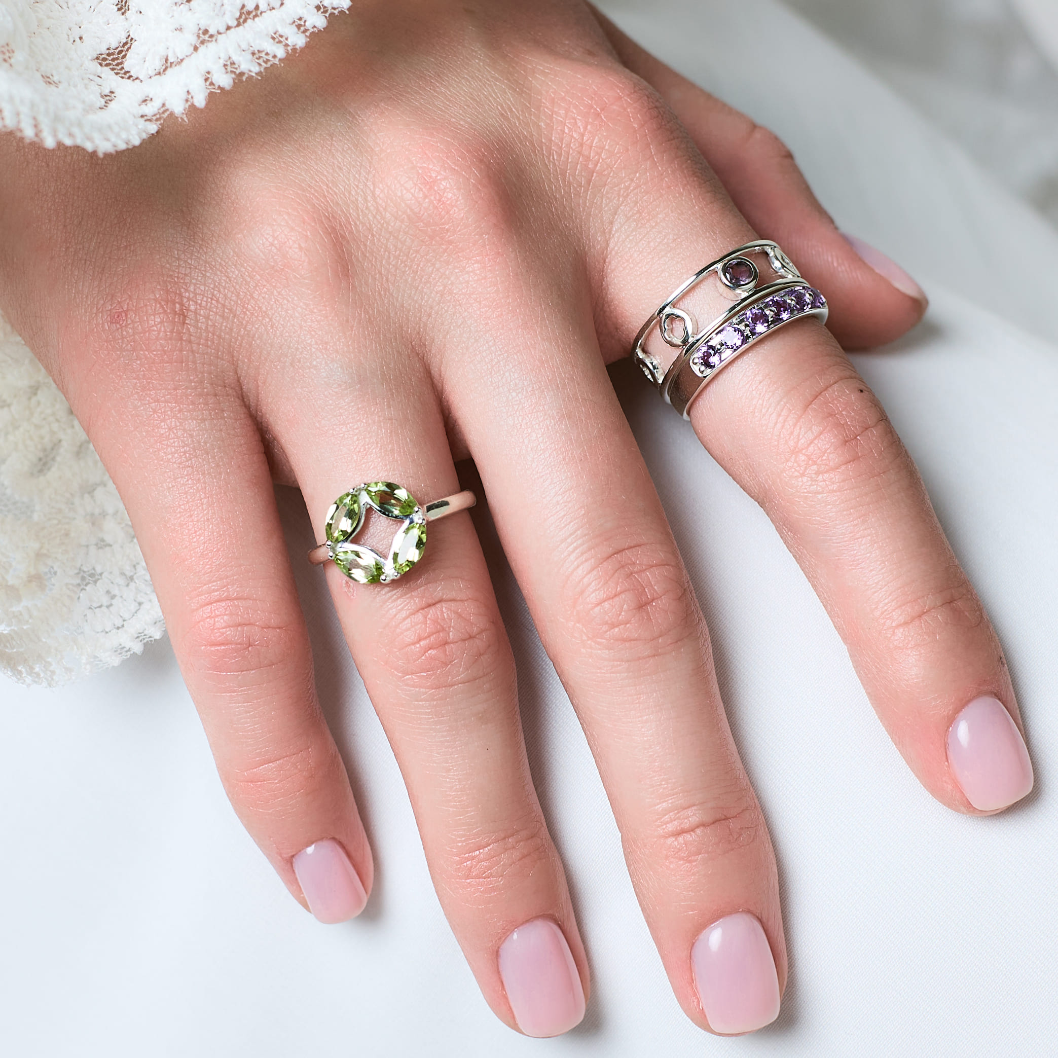Рисунок кольца из повторяющихся четырехлистников делает его очень воздушным и легким украшением, а маленький камень добавляет цветной акцент. Ширина кольца - 6 мм.