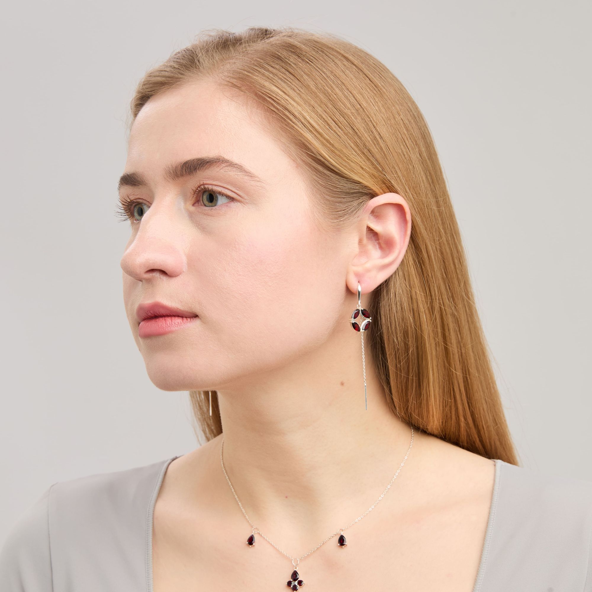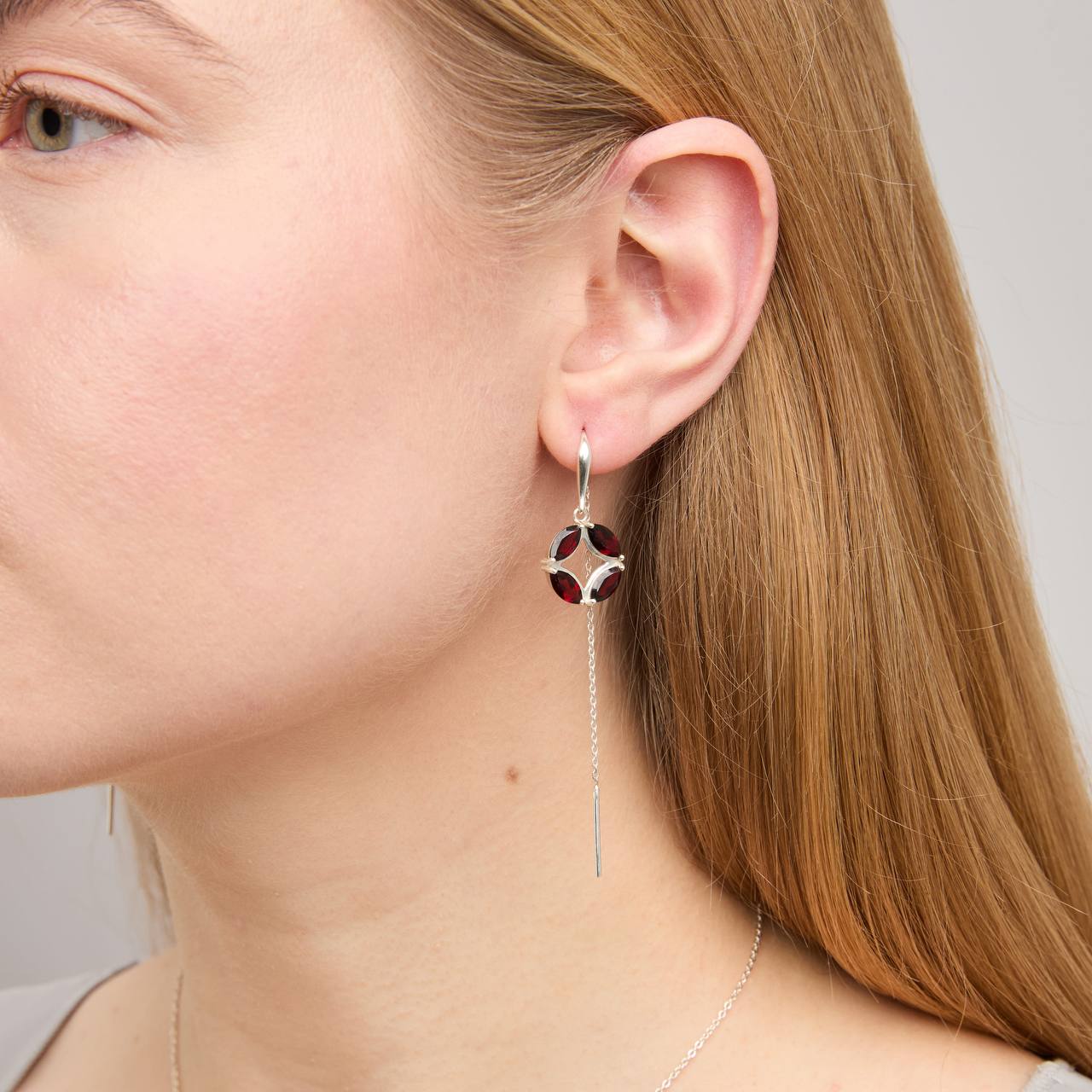 Эти нарядные протяжки имеют удобную форму штырька и надежно держатся в проколе. Декоративная часть серьги из четырех гранатов в огранке «Маркиз», переходит в цепочку длиной 6,5 см с блестящей гранью. Такая огранка по форме напоминает лодочку или романтичную улыбку маркизы, кому как больше нравится.