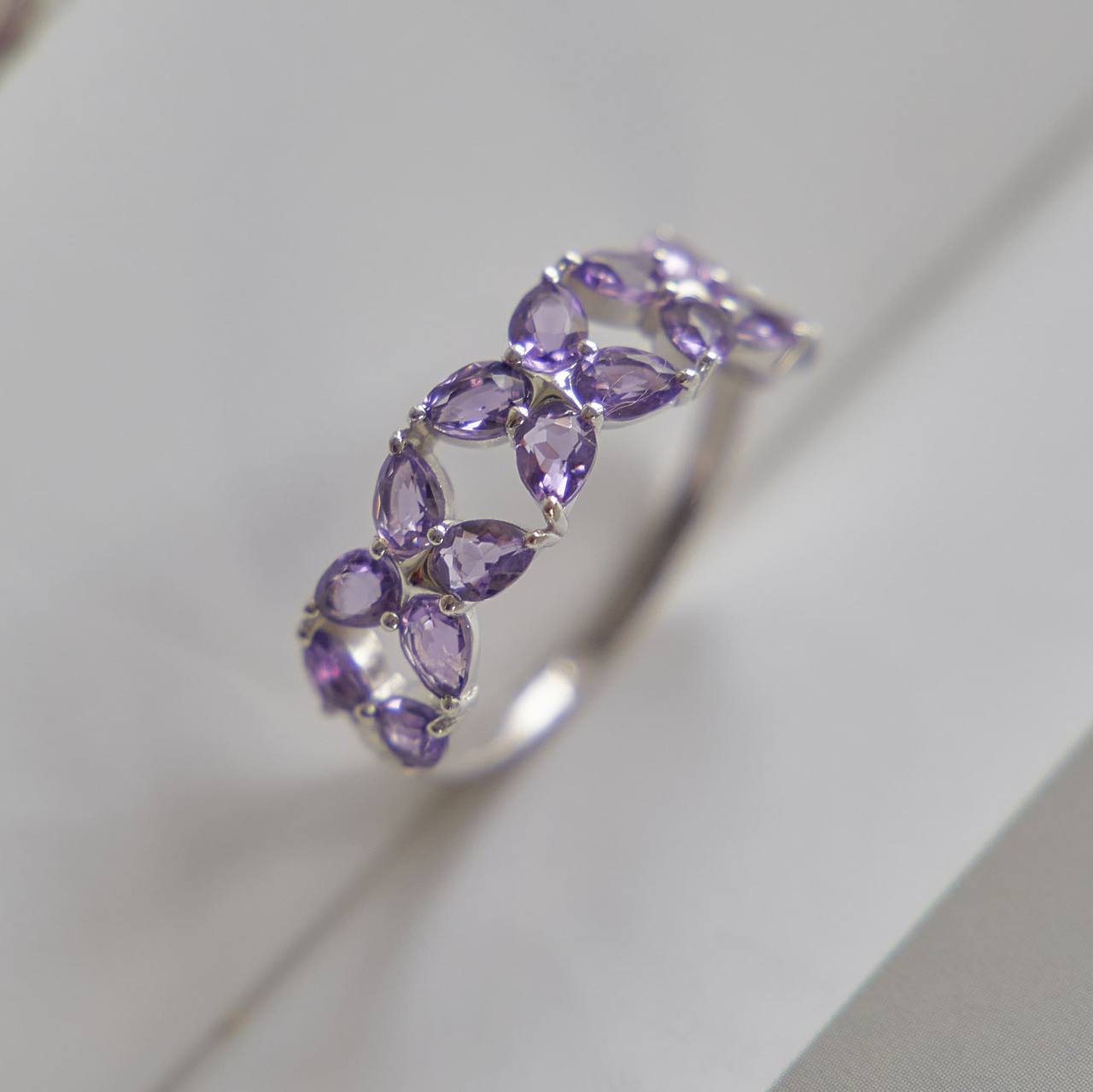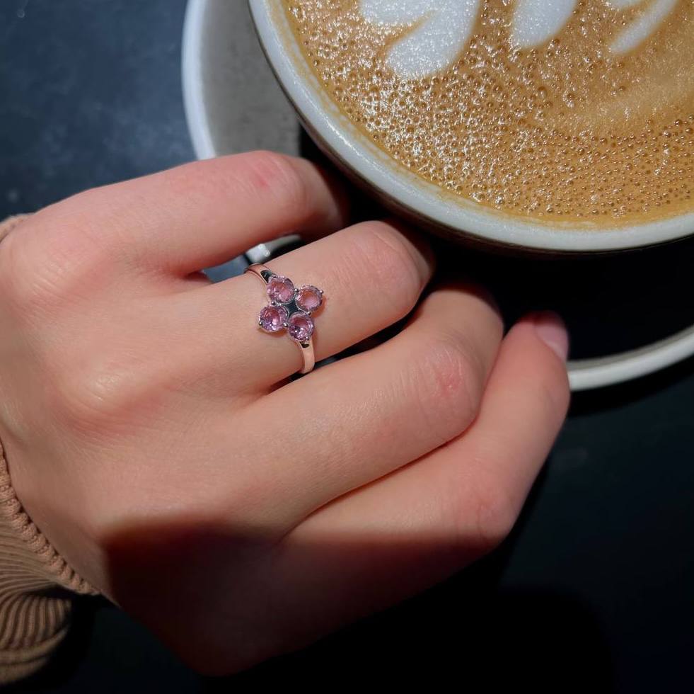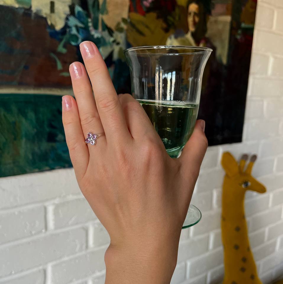 Cамое нарядное и эффектное украшение коллекции. Камушки ловят свет и буквально искрятся, а благодаря продуманным деталям, колечко удобно сидит, не цепляется и мягко чувствуется на руке. Это кольцо стало первым в подборке, потому что камни в огранке Груша складываются в маленькие соцветия, которые всегда цветут.Заказывайте любой из трех камней - топаз, гранат или аметист.
