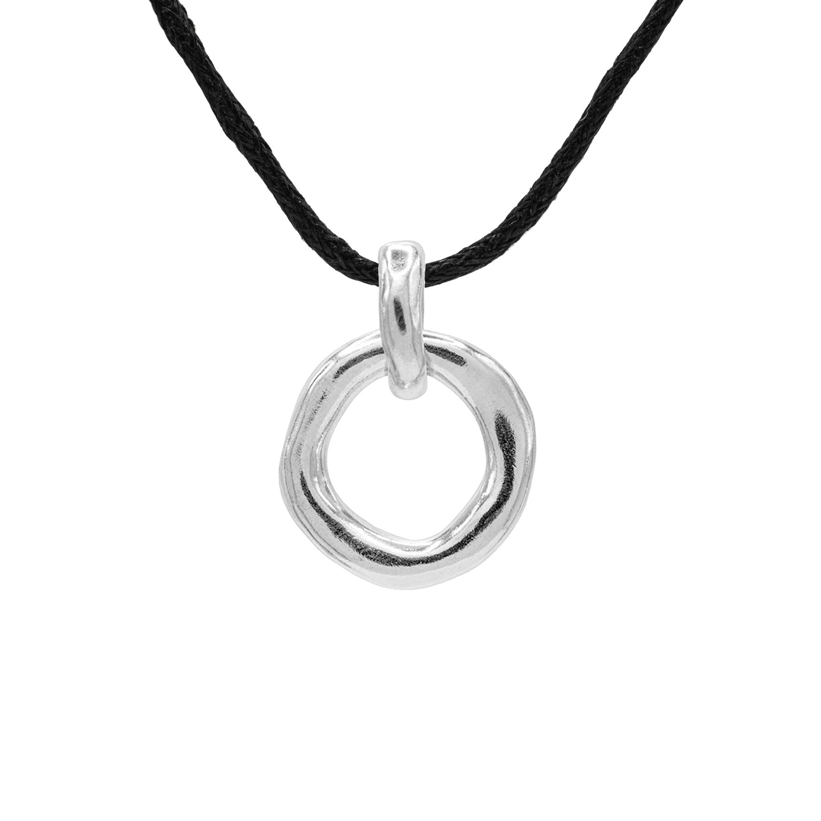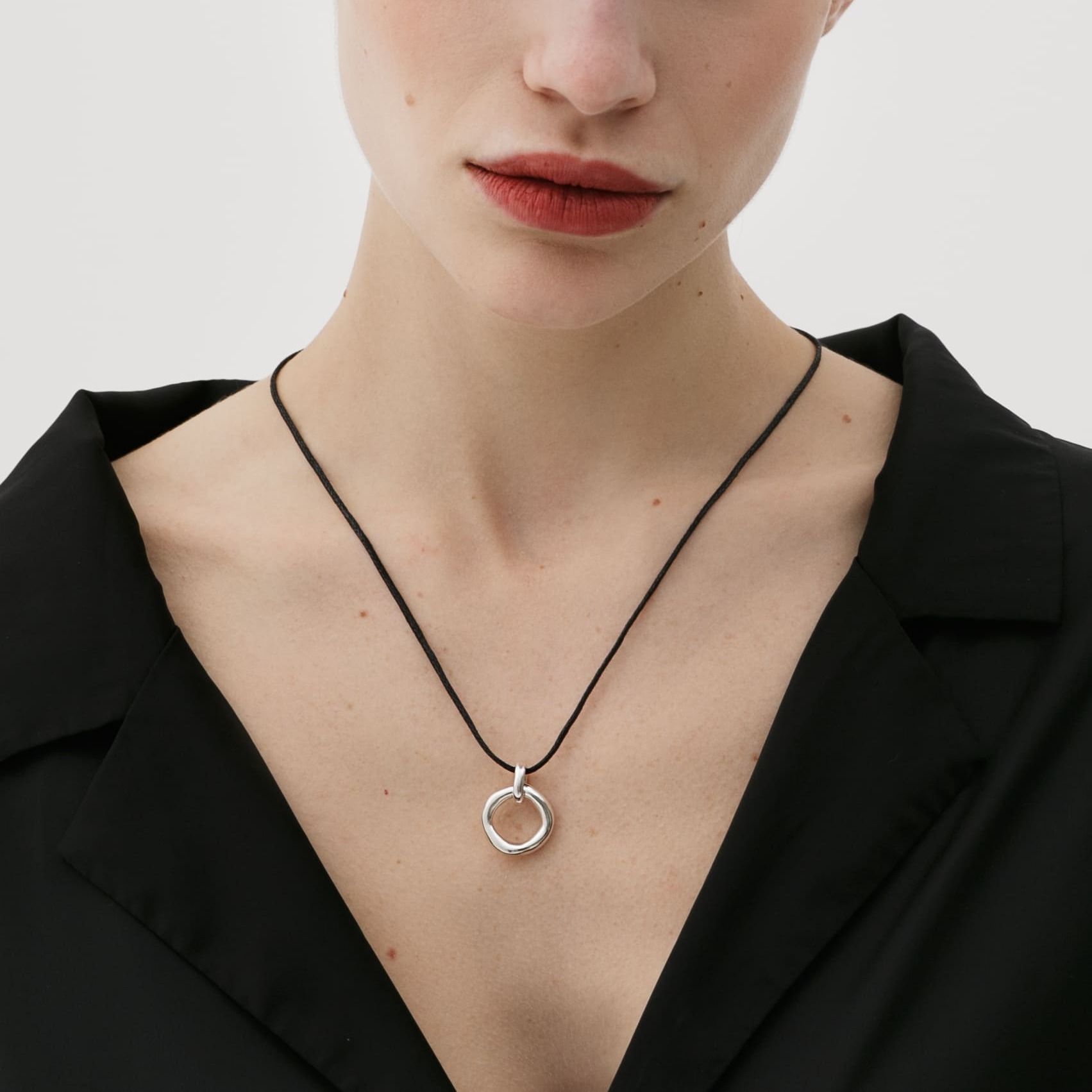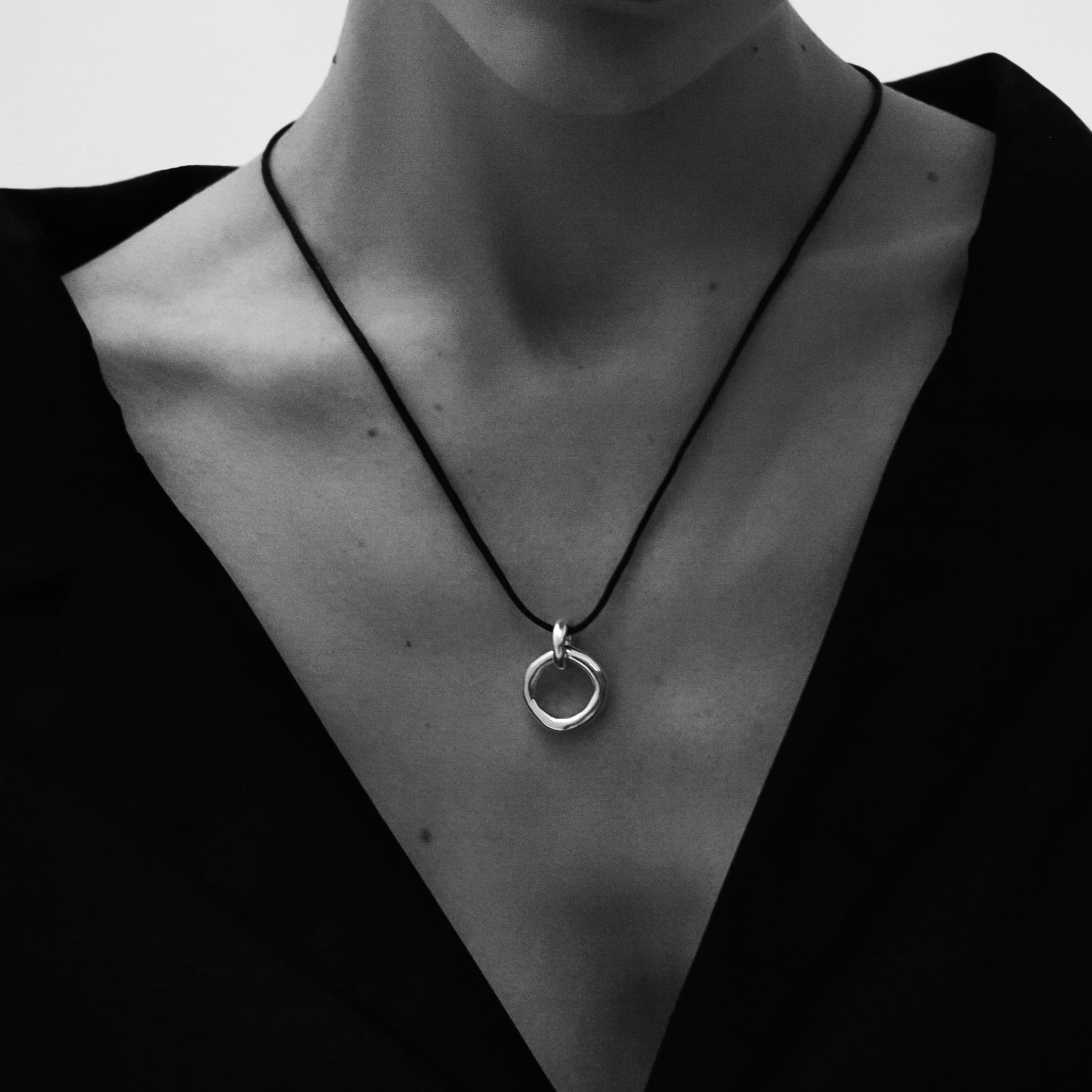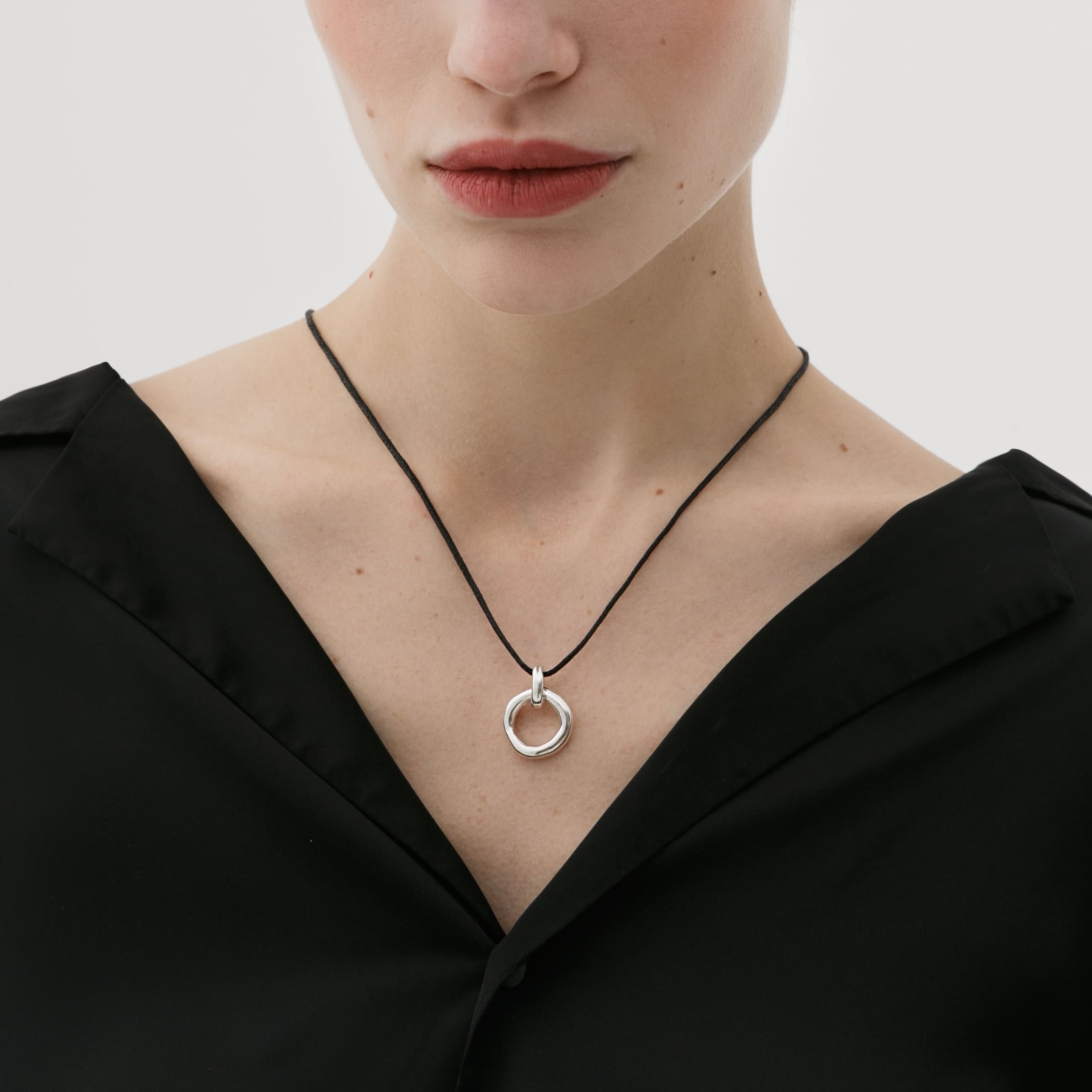 Круглая подвеска из серебра с сатиновой текстурой на текстильном шнурке. Слегка асимметричная форма и лаконичный дизайн в этом украшении делают его максимально универсальным и подходящим ко всему.
