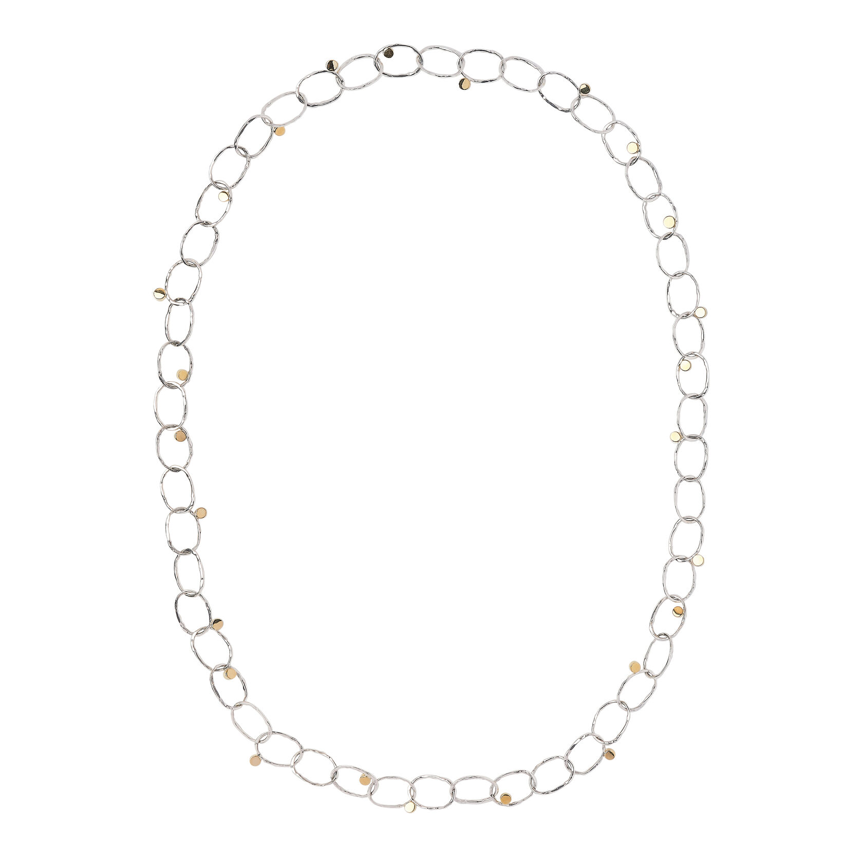 Длинное колье из битого серебра с латунными монетками. Сочетание белого и желтого металла в этом украшении делает его максимально универсальным и подходящим ко всему.