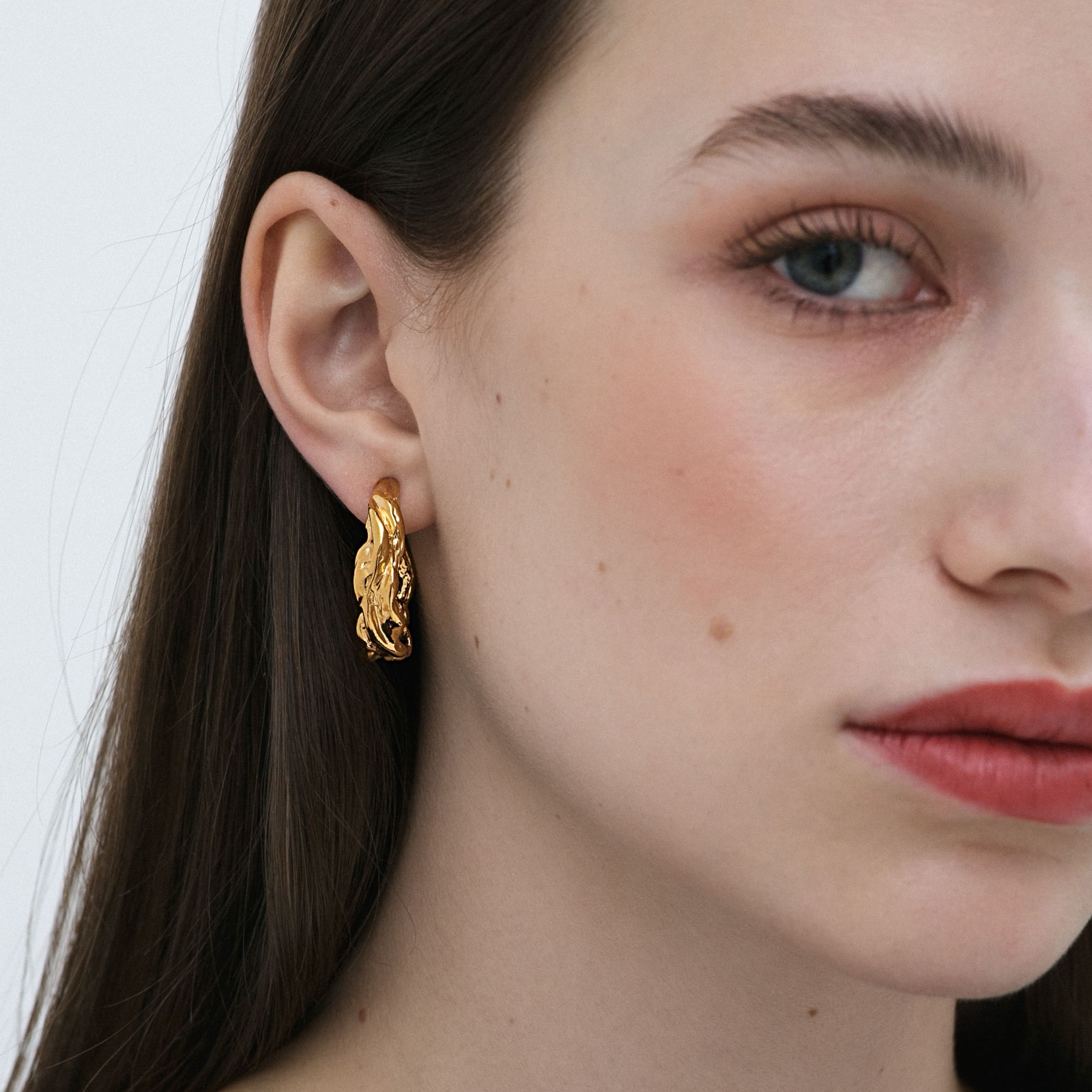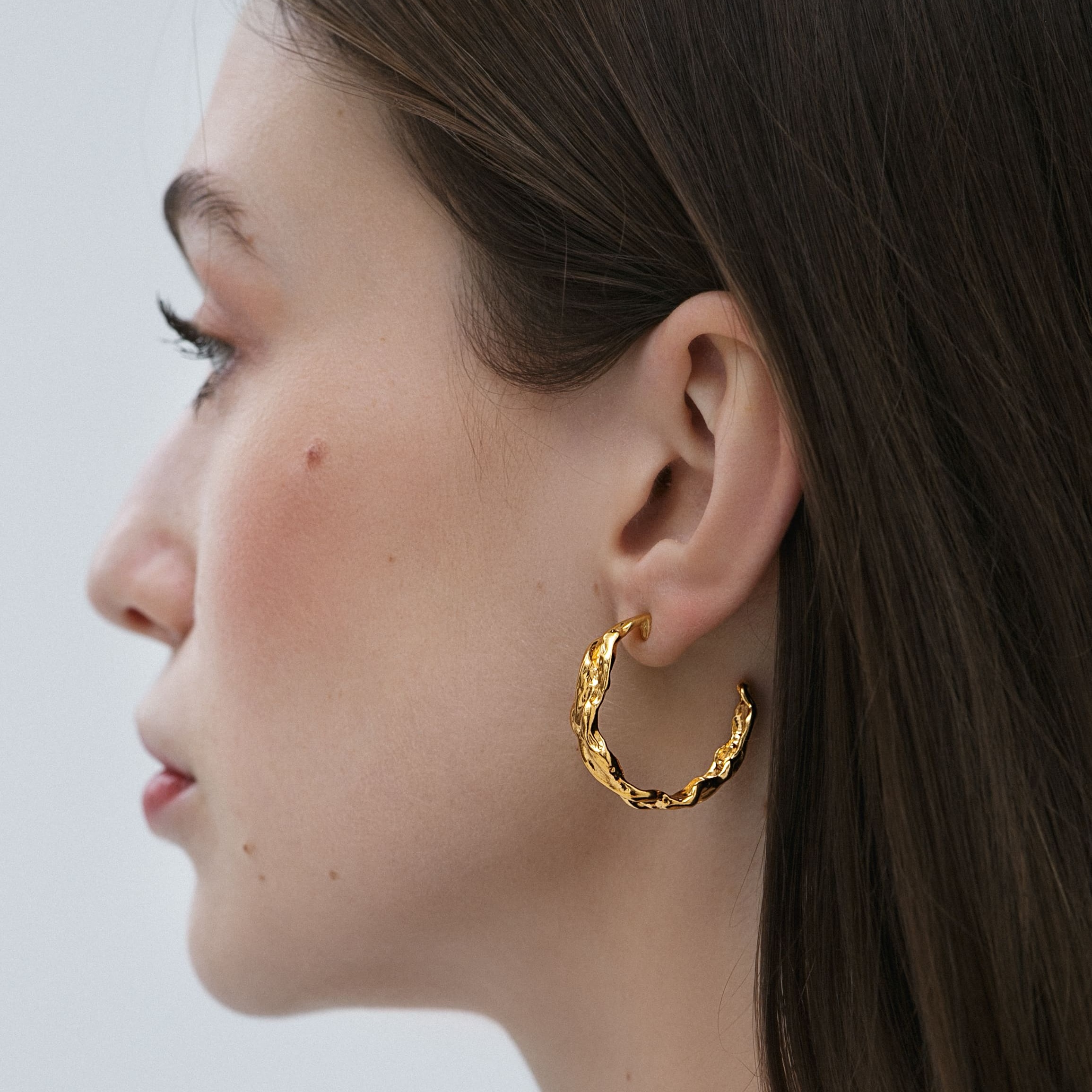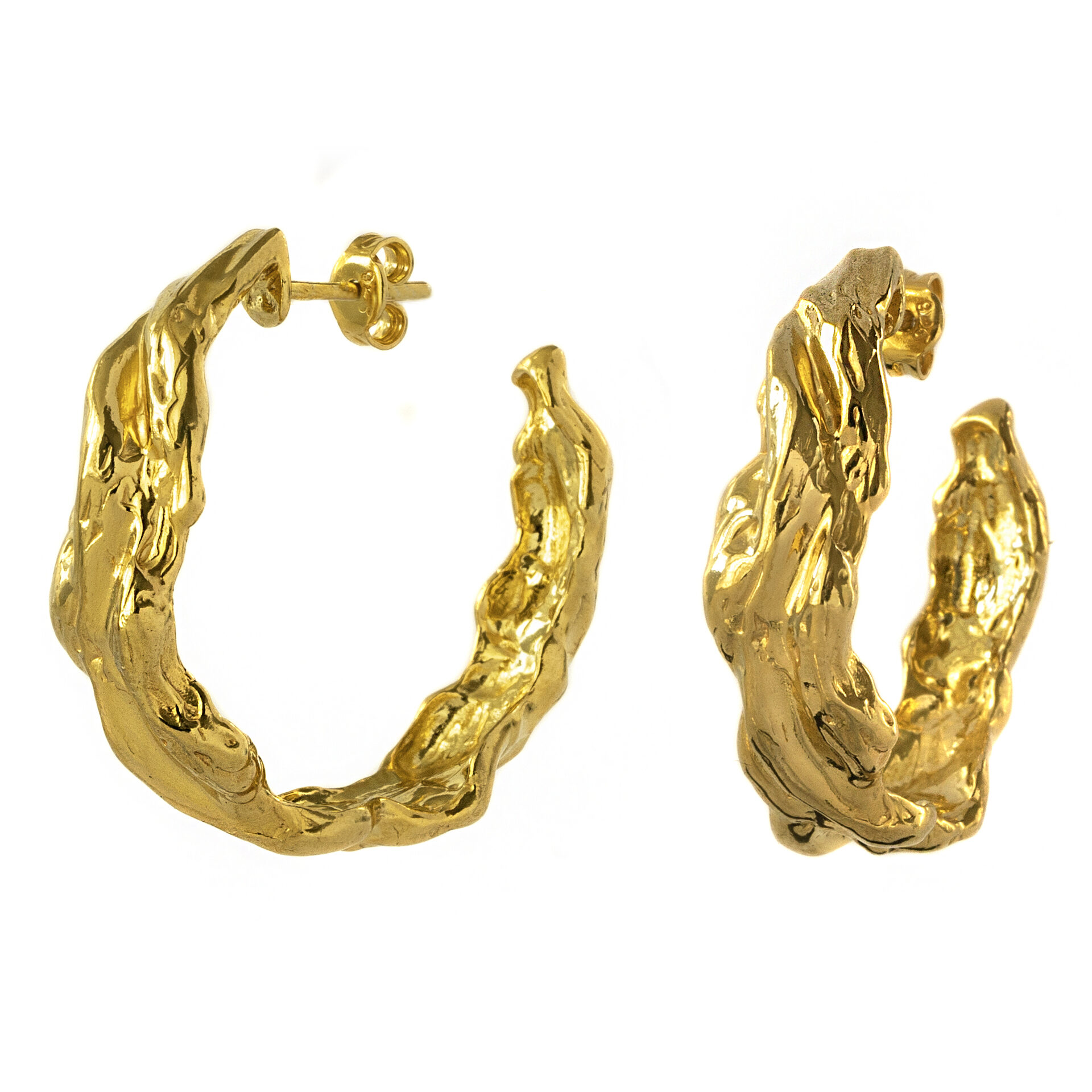 Позолоченные серьги-кольца с эффектной текстурой. Массивные, женственные, с мерцающей формой, напоминающей застывшую карамель.