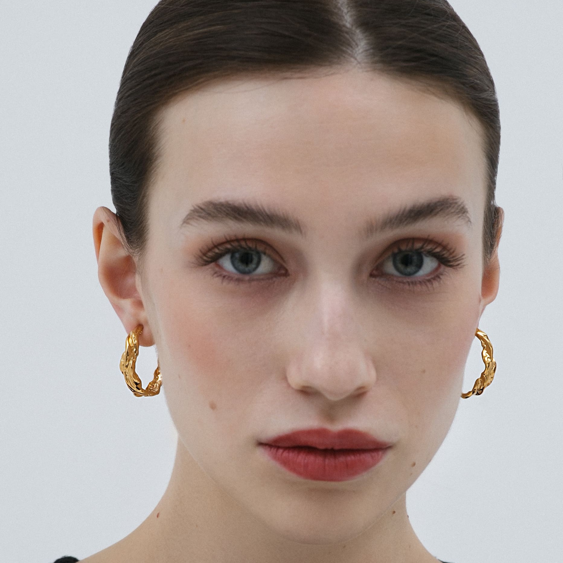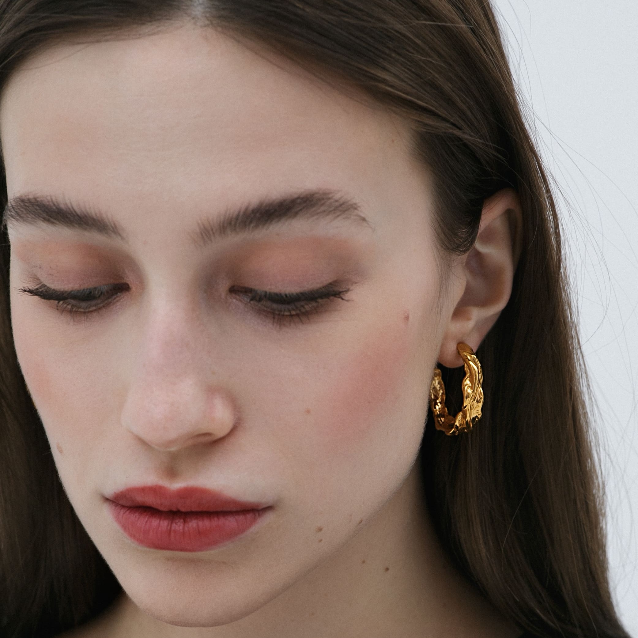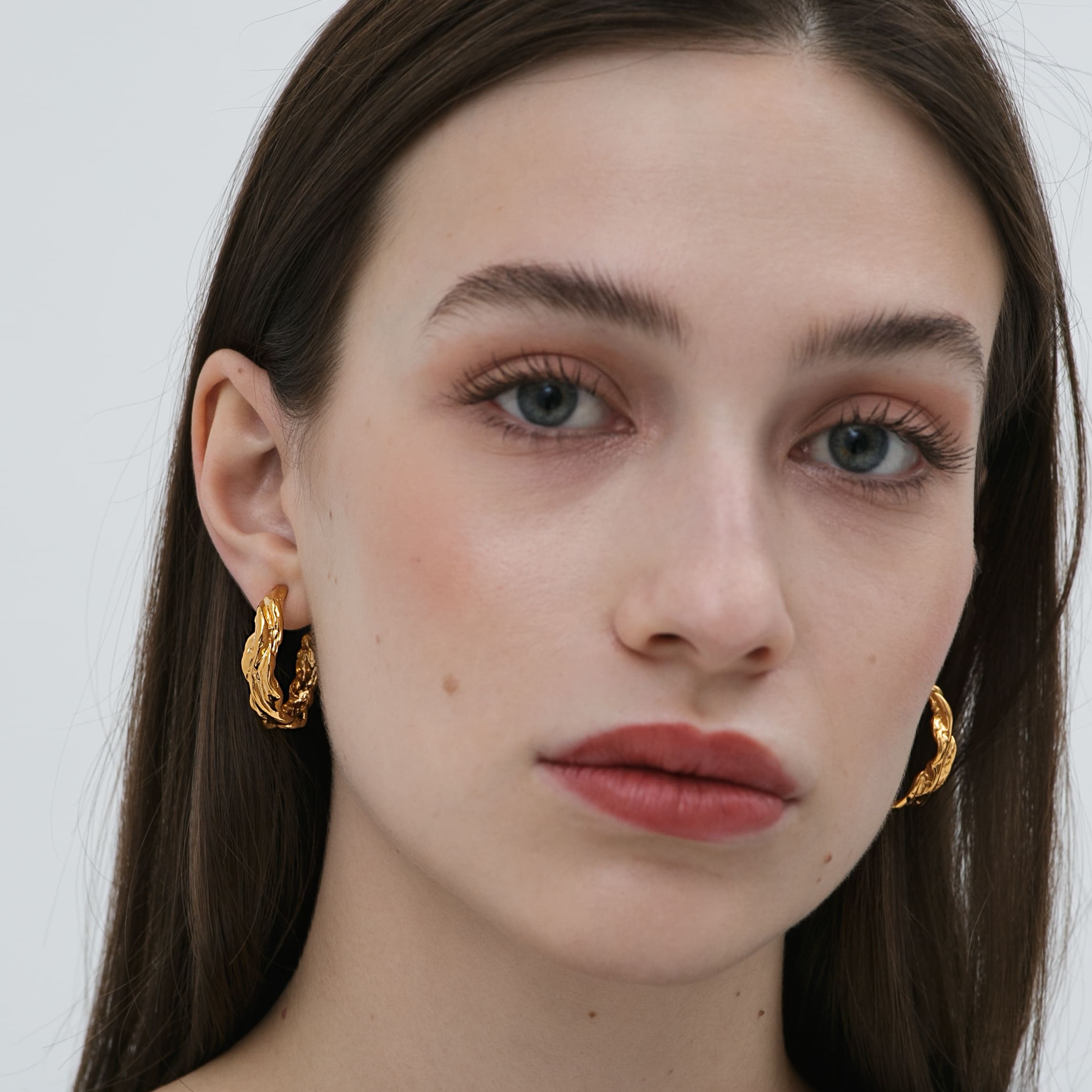 Позолоченные серьги-кольца с эффектной текстурой. Массивные, женственные, с мерцающей формой, напоминающей застывшую карамель.